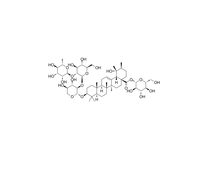【英文別稱】 Urs-12-en-28-oic acid, 3-[(O-6-deoxy-α-L-mannopyranosyl-(1→2)-O-β-D-glucopyranosyl-(1→2)-β-D-xylopyranosyl)oxy]-19-hydroxy-, β-D-glucopyranosyl ester, (3β,20β)-